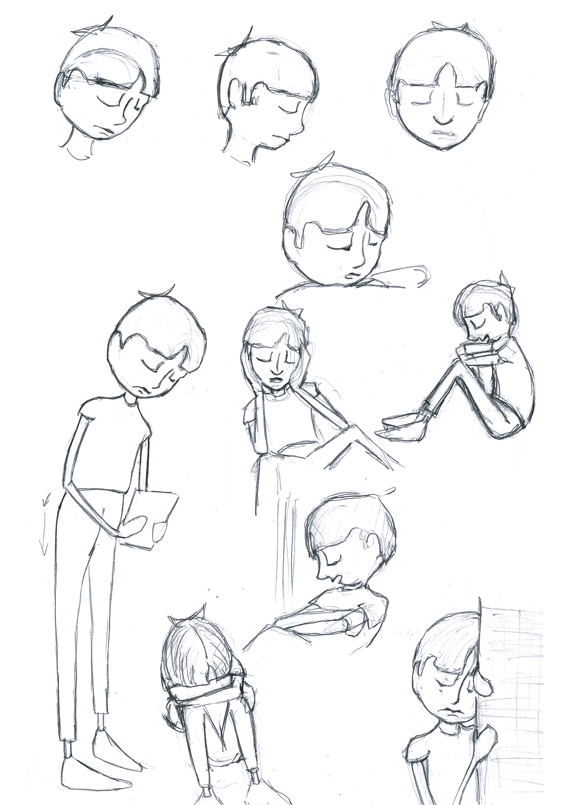 Final Character Designs. I was inspired by a young boy with a long fringe - a nice way to use it as a curtain for the character to hide behind...